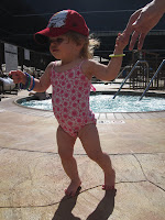 Besides a great trip, Cate is becoming more vocal all the time (much to the chagrin of some of the passengers on our flight!). She can pretty much repeat back anything you say, including reciting each letter of the alphabet. She is getting really good at identifying some letters, including A, B, I, M, N, and O. She for some reason loves I and O! Cate is trying to learn her colors - she is pretty good at blue, and starting to pick up on yellow, red, orange, purple, and pink. She is becoming more particular about picking out what she is going to wear and whether she wants her "hat" (in the sun) or "hair bow".
